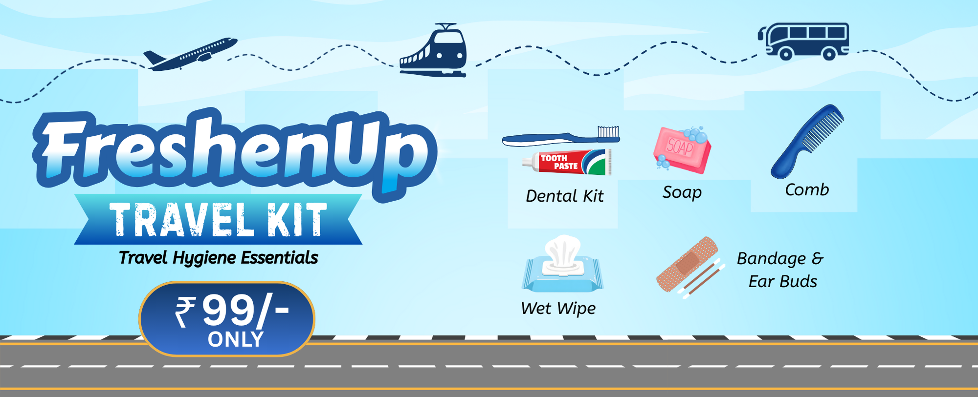 FreshenUp Travel Kit is designed for modern travellers who value hygiene, comfort, and convenience. Our kits are perfect for railway stations, bus stands, tours, and long journeys. Compact, affordable, and thoughtfully curated for men and women.