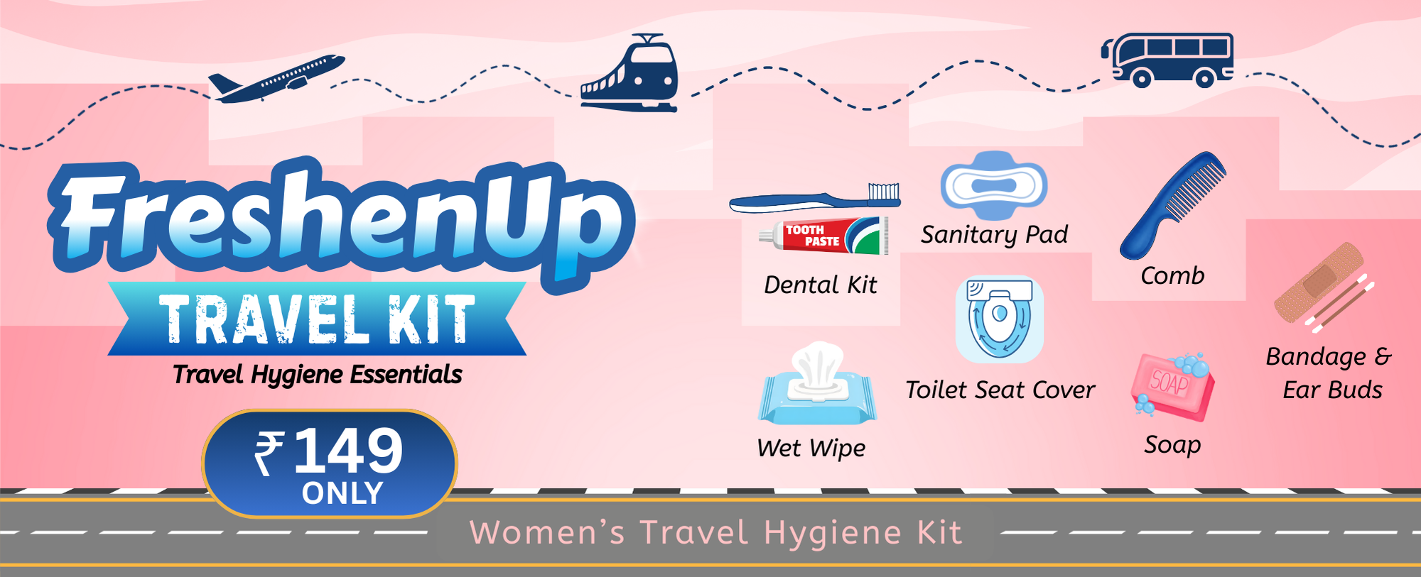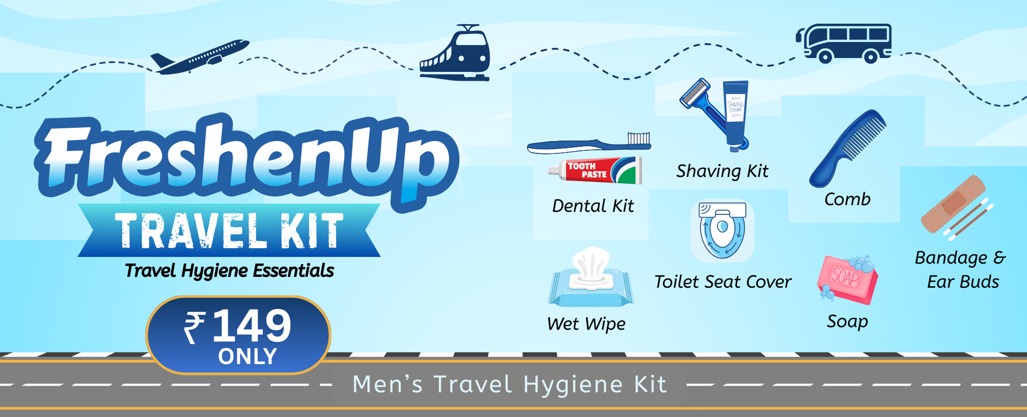 FreshenUp Travel Kit is designed for modern travellers who value hygiene, comfort, and convenience. Our kits are perfect for railway stations, bus stands, tours, and long journeys. Compact, affordable, and thoughtfully curated for men and women.